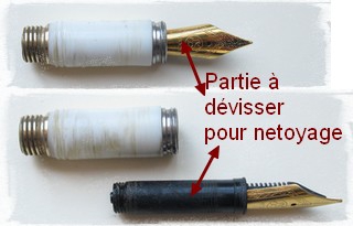 Un stylo-plume doit être nettoyé tous les trois mois environ. Le nettoyage est particulièrement important si l’encre a séché en raison d’une non-utilisation prolongée ou si le conduit est bouché. Le netoyage est aussi nécessaire lorsqu' on change la couleurde l'encre ou si l’écoulement de l’encre diminue ou s’interrompt. Le nettoyage d'une plume doit être effectué avec de l’eau claire, tiède, sans aucun produit.Pour nettoyer une plume, dévisser la partie de la pointe (voir photo)